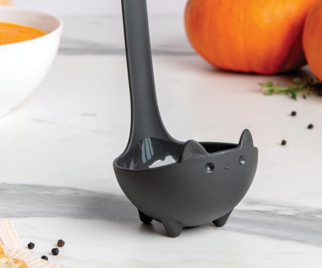 遊び心あふれる、機能的な黒猫・白猫のお玉です。つぶらな瞳や、短い脚、丸いフォルムがとても愛らしく、癒されます。丸く深さがあるので、スープや食材を一度にたっぷりすくうことができます。