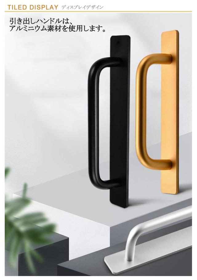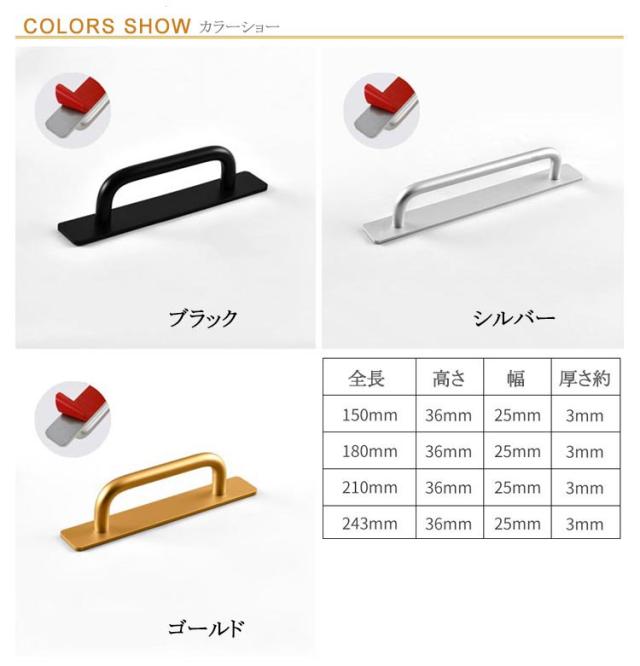 | 4サイズ!取り付け簡単!粘着タイプの取っ手。 引き出しハンドルは、アルミニウム素材を使用します。 表面が滑らかなので使い心地も良く、 傷の心配もありません。安心してお使いいただけます。 シンプルでモダンなデザインでどんな場所でも違和感なくマッチします。 | |