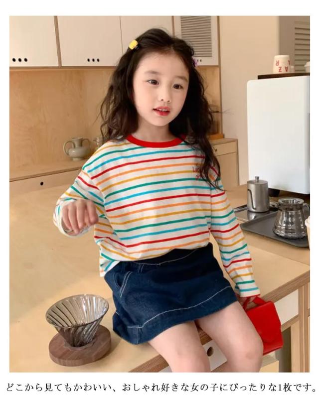 Tシャツ 秋 レインボー 長袖 女の子 トップス 冬 ポーダー 秋服 子供服 キッズ カジュアル トレーナー 長袖 韓国子供服 ストライプ 小学生 クルーネック オシャレ 通園 通学 レインボー 保育園 幼稚園 普段着