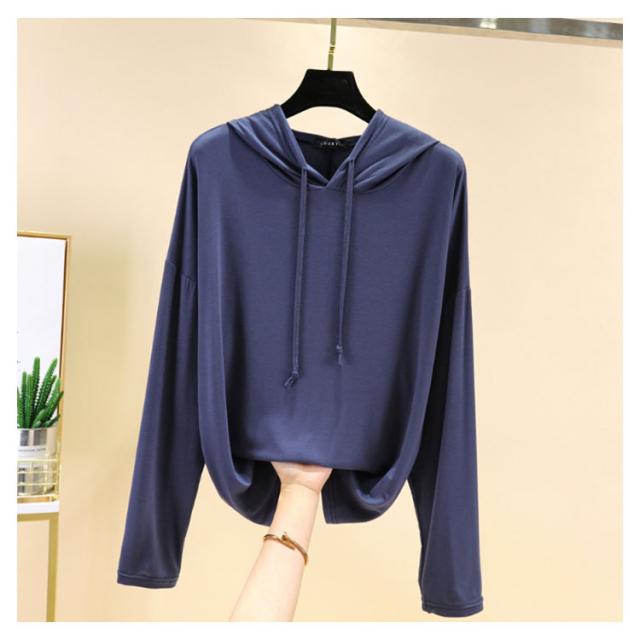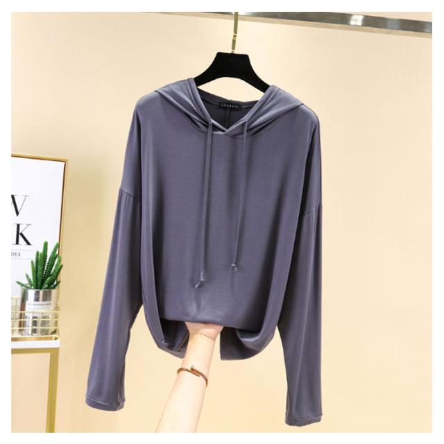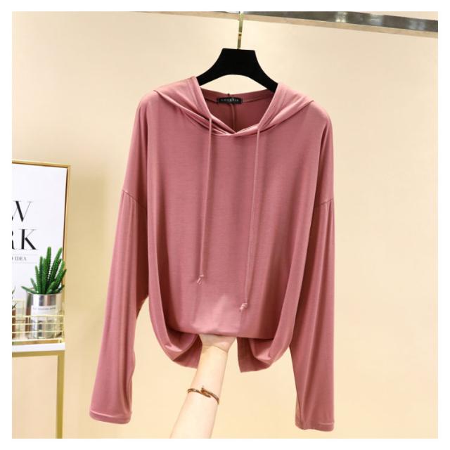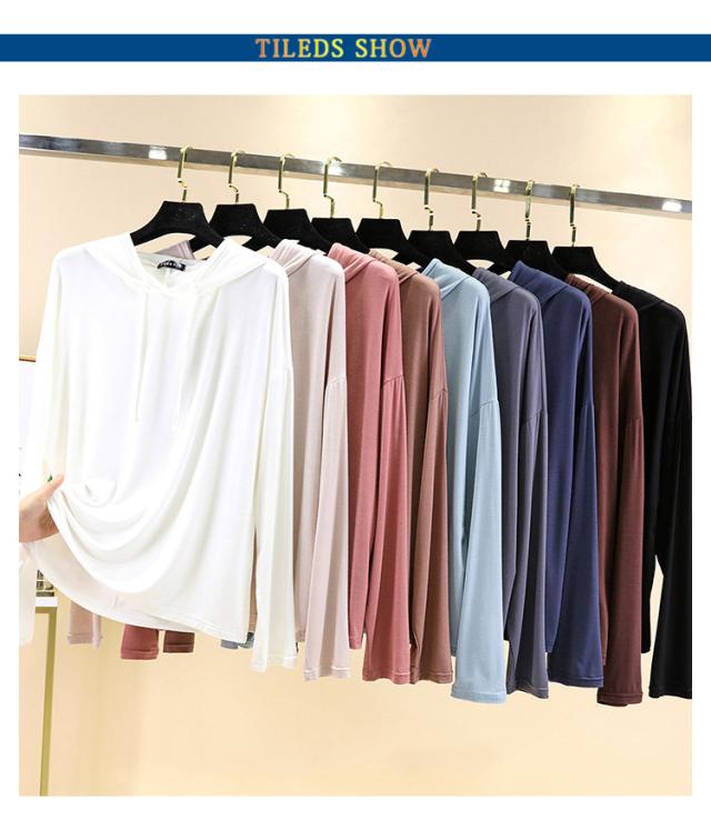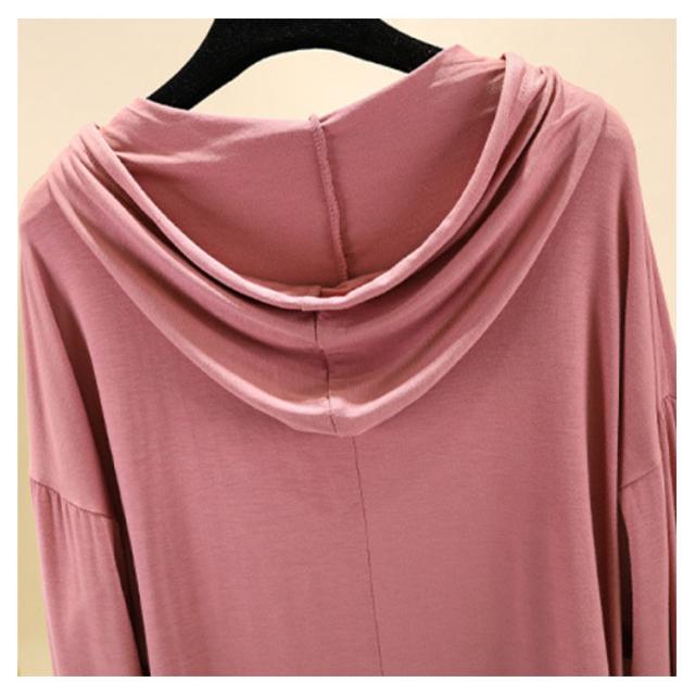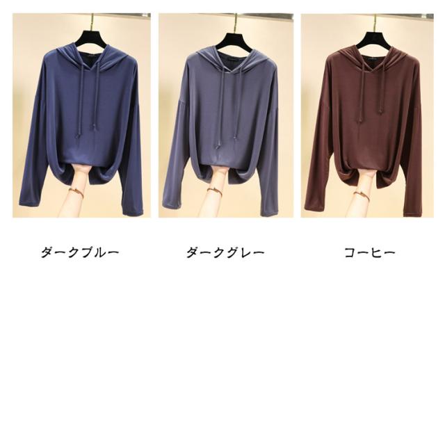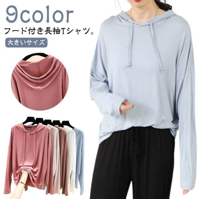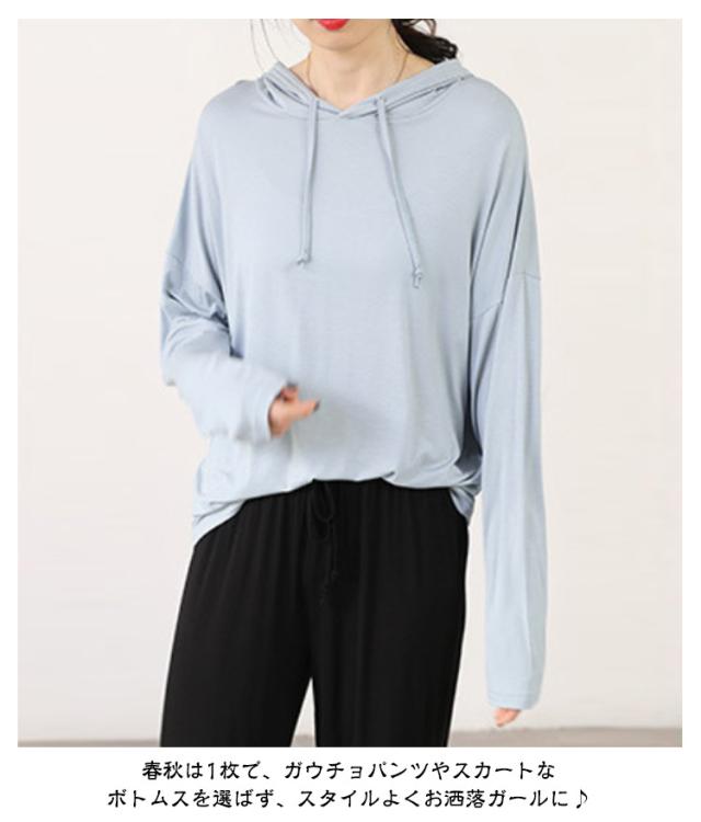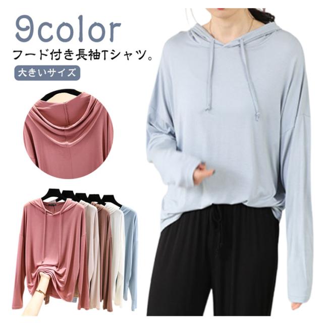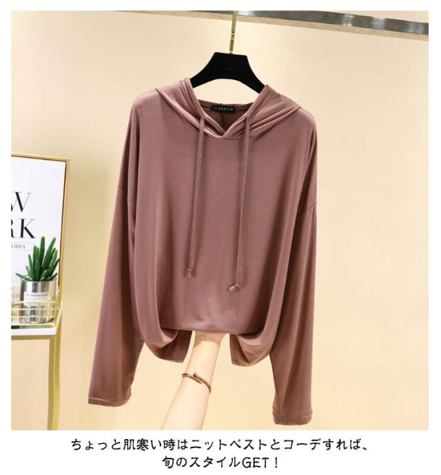 | 【9color】フード付き長袖Tシャツ。 生地は伸縮性があり、柔らかい肌触りで着心地快適。 体型をさりげなくカバーするゆるシルエットが嬉しいポイント。 春秋は1枚で、ガウチョパンツやスカートなボトムスを選ばず、スタイルよくお洒落ガールに♪ ちょっと肌寒い時はニットベストとコーデすれば、旬のスタイルGET! | |