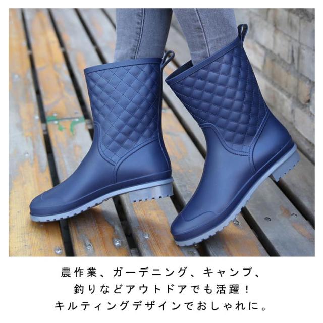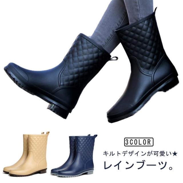 ブーツ おしゃれ ミドル丈 レディース ブラック 長靴 雨靴 防水 レインシューズ 雨 レインブーツ ショートブーツ 晴雨兼用 レインブーツ キルティング 滑らない きれいめ かわいい カジュアル 通勤 黒 ネイビー ベージュ