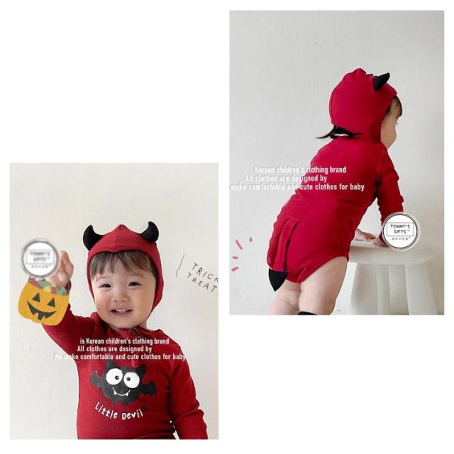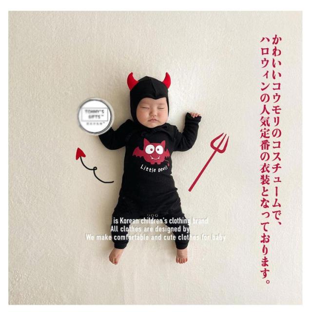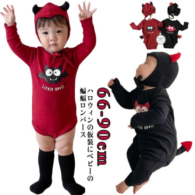 バットロンパース ハロウィン イベント 仮装 蝙蝠 ロンパース 長袖 薄手 ベビー 赤ちゃん コスチューム 2点セット レッド ブラック 帽子付き バット 変装 コウモリ コスチューム 着ぐるみ 子供服 おもしろい 衣装 66 73 80 90 送料無料