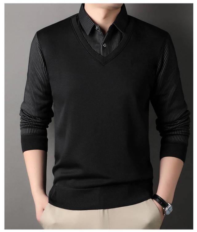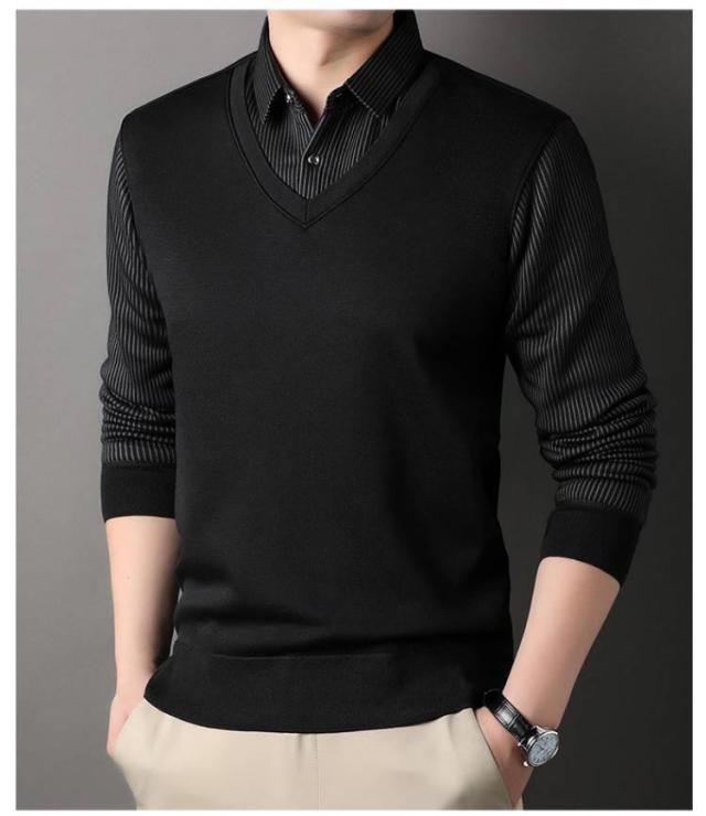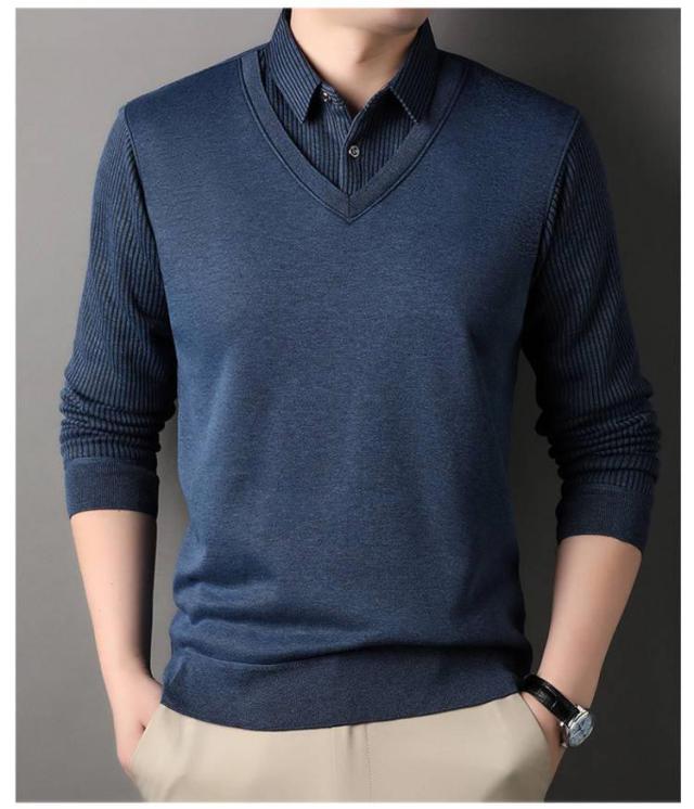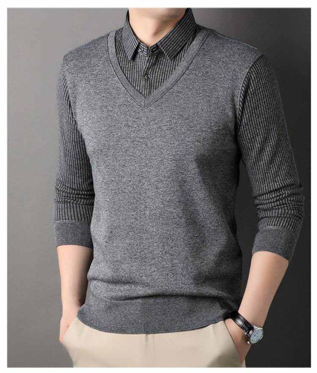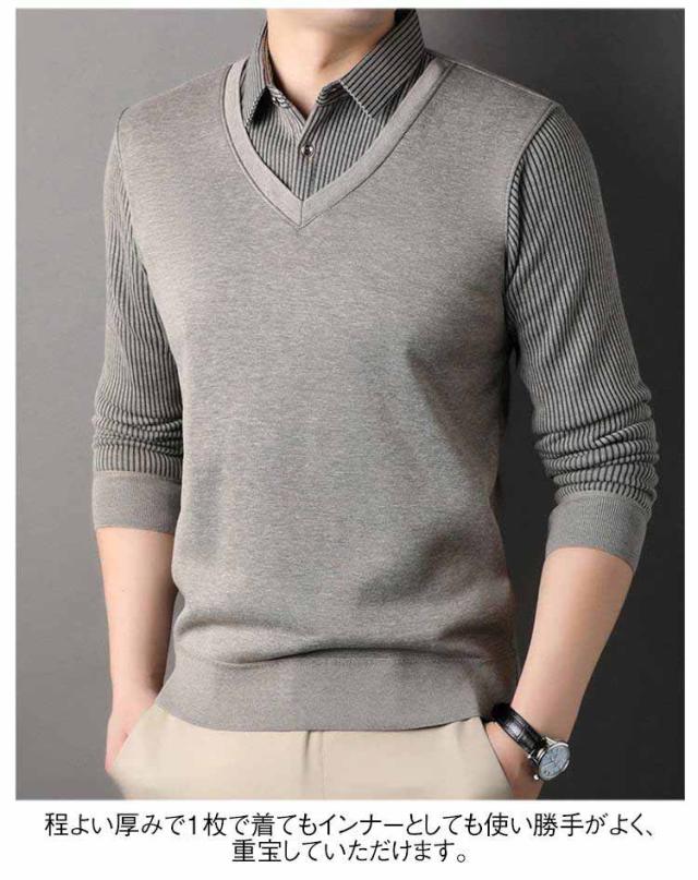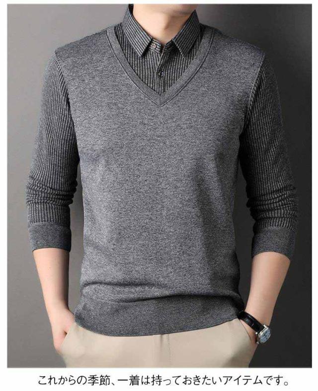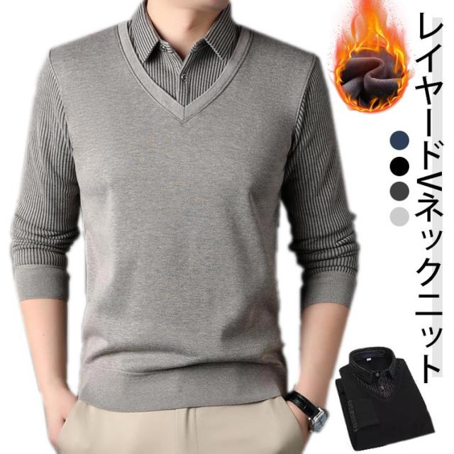 フェイクレイヤード 重ね着風 ニットソー メンズ ニットセーター トップス 長袖 シンプル プルオーバー 裏起毛 重ね着風 重ね着風 大きいサイズ あったか 暖かい おしゃれ セーター 無地 ゴルフウェア カジュアル 秋