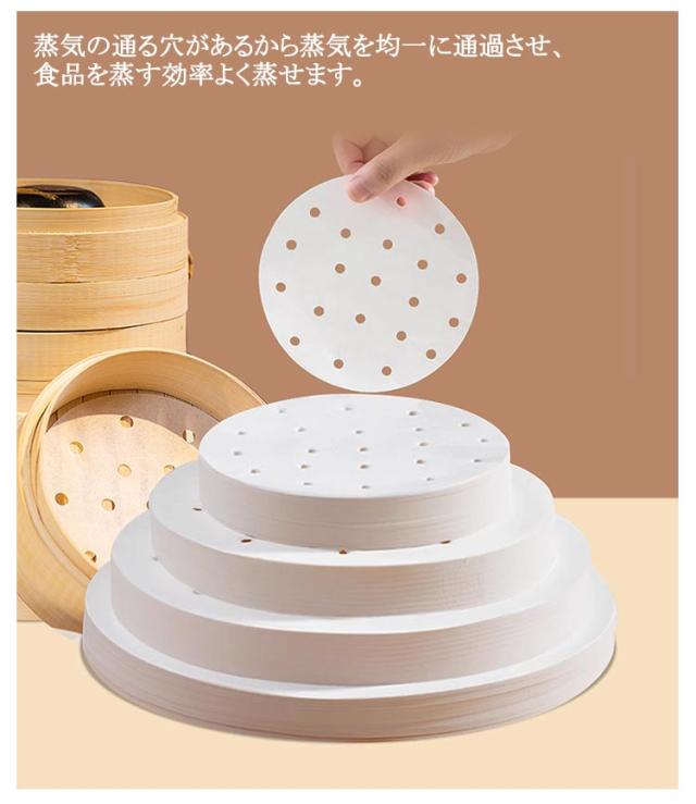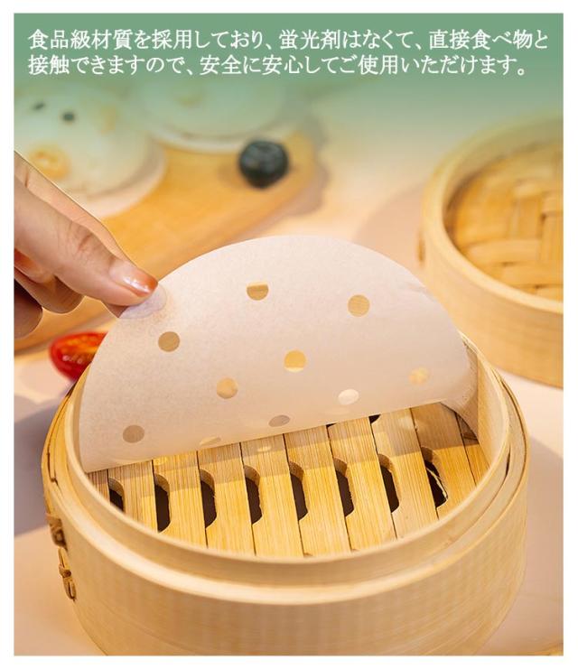 | せいろ専用平面型蒸篭紙500枚セットです♪ セイロの底に敷く事で、点心類の皮や食材がセイロにつかず、使用後のお手入れもぐっと楽になります。 蒸気の通る穴があるから蒸気を均一に通過させ、食品を蒸す効率よく蒸せます。 餃子、饅頭、中華饅頭、シュウマイ、豚まん、肉まん、焼売、小龍包などに ♪ 食品級材質を採用しており、蛍光剤はなくて、直接食べ物と接触できますので、安全に安心してご使用いただけます。 食材をせいろに載せ、蓋をして湯気で蒸すだけで、誰でも手軽にヘルシーで美味しい料理を楽しめます。 | |