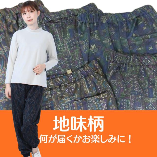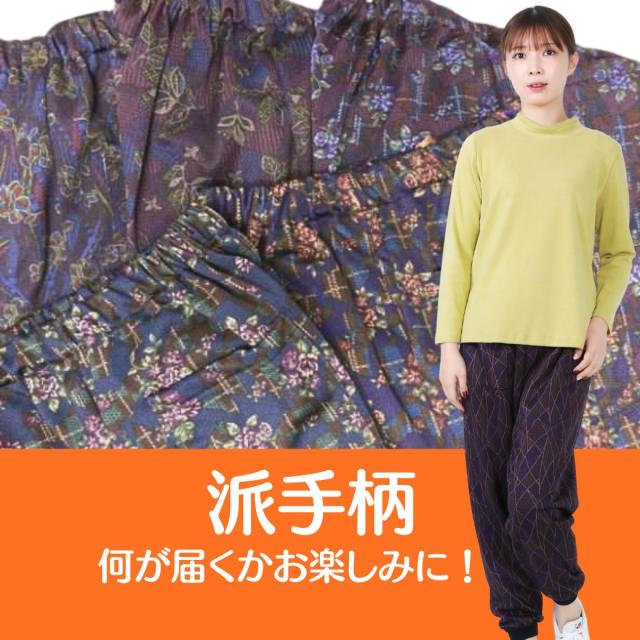 【サイズ】Mサイズ ウエスト64.0-70.0ヒップ87.0-95.0股下59.0Lサイズ ウエスト69.0-77.0ヒップ92.0-100股下60.0LLサイズ ウエスト77.0−85.0ヒップ97.0-105股下62.03Lサイズ ウエスト85.0-93.0ヒップ102-110股下65.0【素材】 ポリエステル 100%【特徴】日本製で安心安全な縫製で作っております柄は花柄/葉柄などがあり、地味柄派手柄から選べます。どれが届くかはお楽しみに!暖かい裏起毛で秋冬に大活躍致します家庭洗濯対応しています。【注意事項 】■素材の特性上、お洗濯やクリーニングにより多少の縮みやねじれが生じる場合もございます。■商品の撮影には最大限注意を払っておりますが、閲覧時のモニター環境によりましては実際の商品と若干違うお色味に映ることもございます。