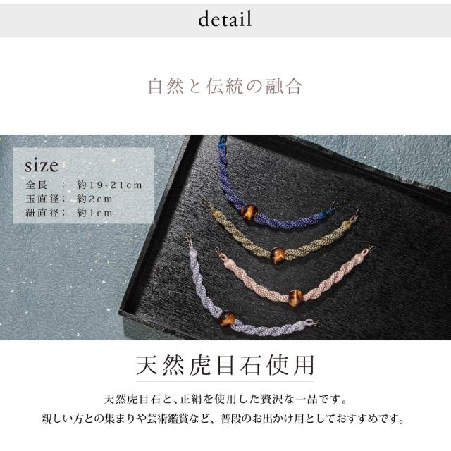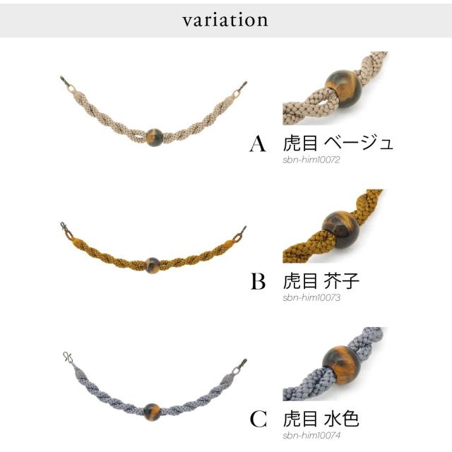 正絹(シルク100%)の捻りを加えた丸組紐に、天然石の虎目石の玉飾りが施されています。