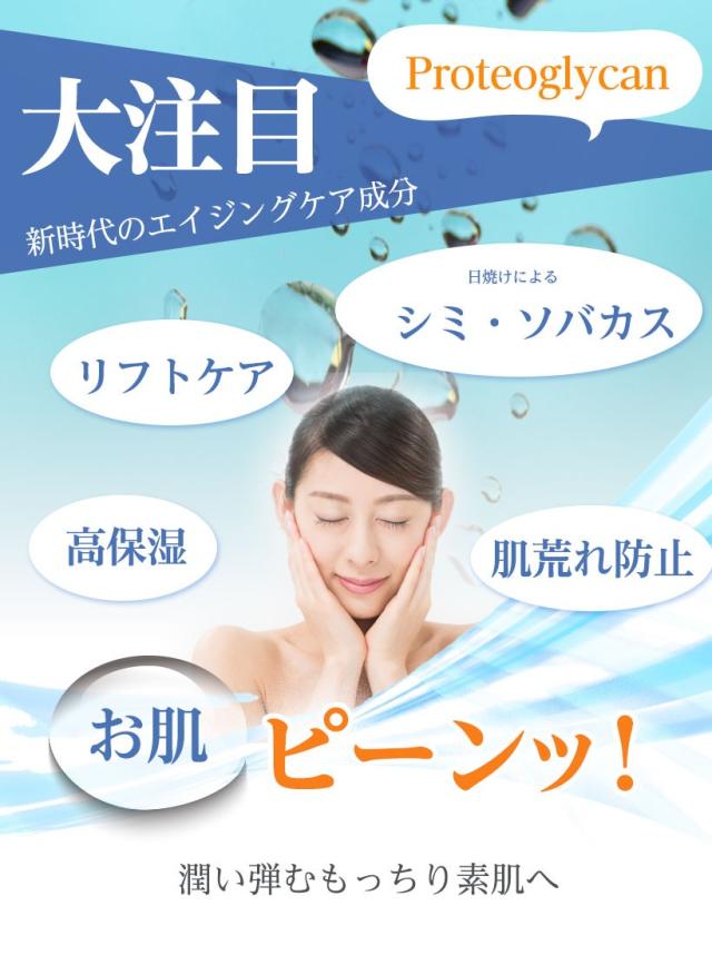 プロテオグリカンには、EGF(上皮細胞増殖成長因子)と同じような作用があり、肌サイクルを正常化し、日焼け肌や年齢肌をケアします。