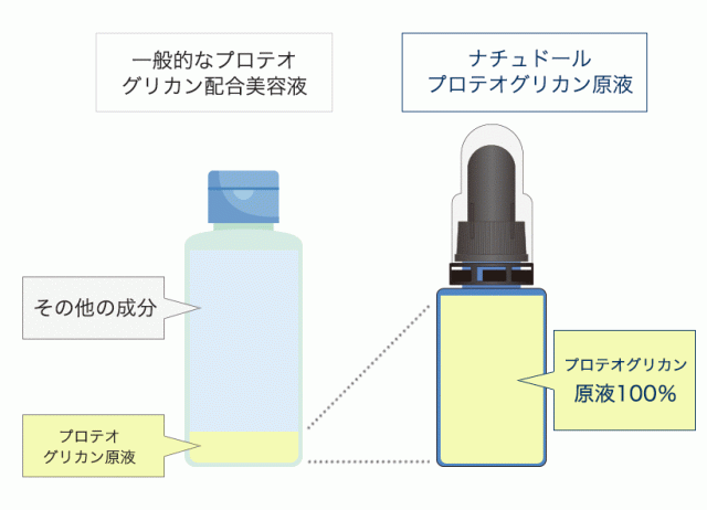 ナチュドールのプロテオグリカン原液は、水溶性プロテオグリカン、水、BGの他に余計な成分が入っていない高濃度で純粋な100%原液化粧品です。