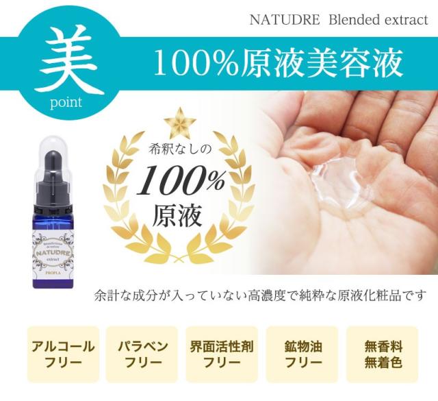 原料をそのまま瓶詰した化粧品のことを一般的に原液化粧品と呼んでいます。プロプラ原液は原料メーカーから仕入れた原料をそのまま化粧品工場で瓶詰した、100%原液美容液です。