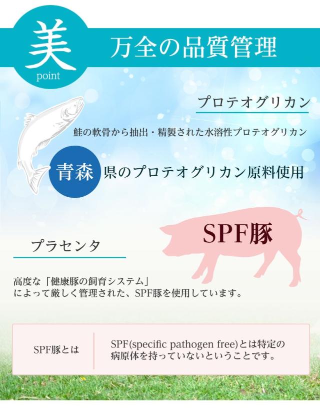 アミノ酸、ビタミン、コラーゲン、年齢肌にアプローチする栄養素として知られている核酸、細胞と細胞を繋いで健康な肌をつくるムコ多糖体(ヒアルロン酸など)など、プラセンタ(胎盤エキス)は栄養の宝庫と言えるのです。また濃度の高い豚プラセンタ(SPF豚)を使用しています。