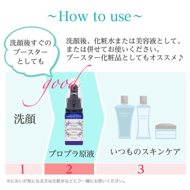 プロプラ原液は希釈なしの原液でありながら、使用感はさらっと軽く、重さやべたつきはゼロ。洗顔後のお肌につけることで、その後のスキンケアをなじみよくする働きがあります。