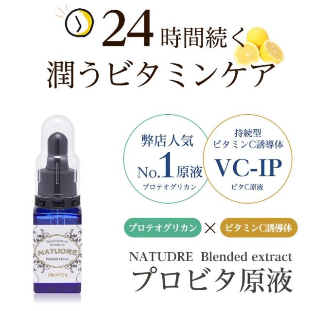 プロテオグリカン原液とビタC原液(油溶性ビタミンC誘導体)が1つになった混合原液美容液です。 ナチュドール プロビタ原液
