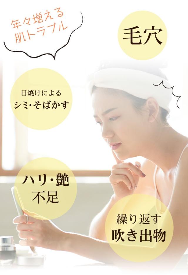 乾燥、リフトケア、日焼けによるシミ・くすみ、毛穴、繰り返す肌荒れなど