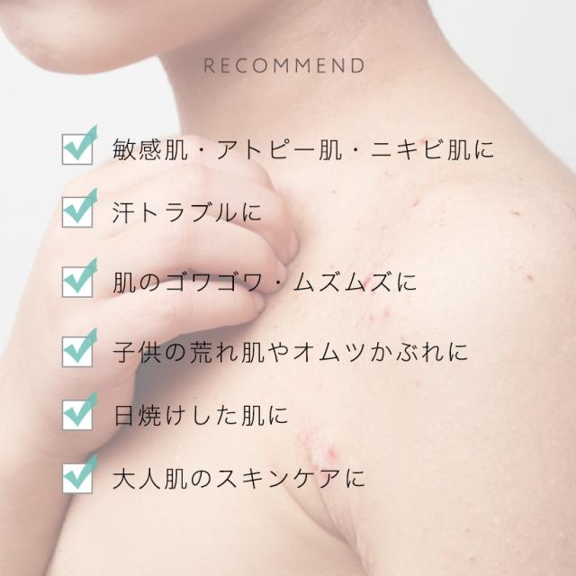 肌荒れや汗荒れ、ニキビ肌や日焼け肌のケア、敏感な赤ちゃんやお子様の保湿、大人肌のエイジングケア等に。