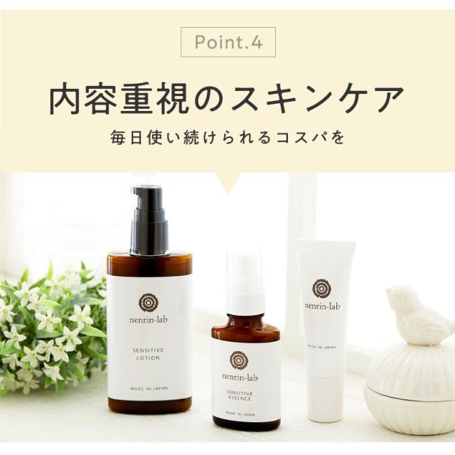 化粧品開発では、売り上げのために広告費やパッケージにコストをかけすぎ肝心の中身は有効成分が微量配合ということがあります。ネンリンラボのセンシティブシリーズは、広告費や容器、パッケージコストを抑え、敏感肌・トラブル肌の方でも使いやすいよう研究を重ね、徹底的に中身にコストをかけています。中身や使用感は絶対重視!でも毎日使いやすい価格を目指し、シンプルパッケージ、簡易包装でのお届けとなっています。