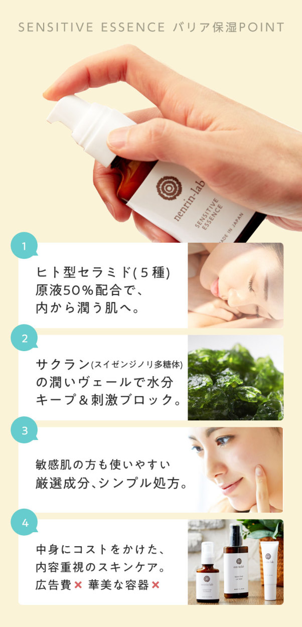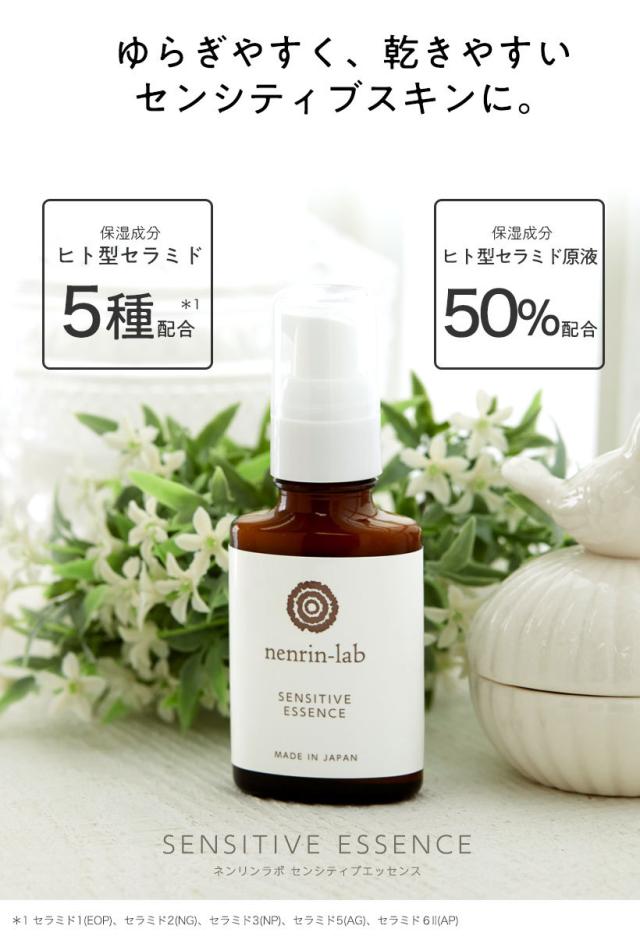 ネンリンラボ センシティブエッセンスは、ヒト型セラミドを5種類(ヒト型セラミド1・2・3・5・6)配合、さらにヒト型セラミド原液は50%配合という超高濃度の美容液です。