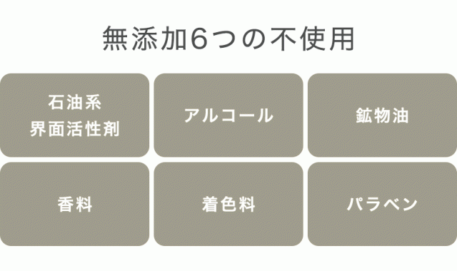 石油系界面活性剤フリー、アルコールフリー、パラベンフリー、香料フリー、鉱物油フリー、着色料フリー、さらにナノテク原料不使用。刺激になる可能性のある成分は極力配合せず、こだわりの保湿成分を厳選配合したシンプル処方。
