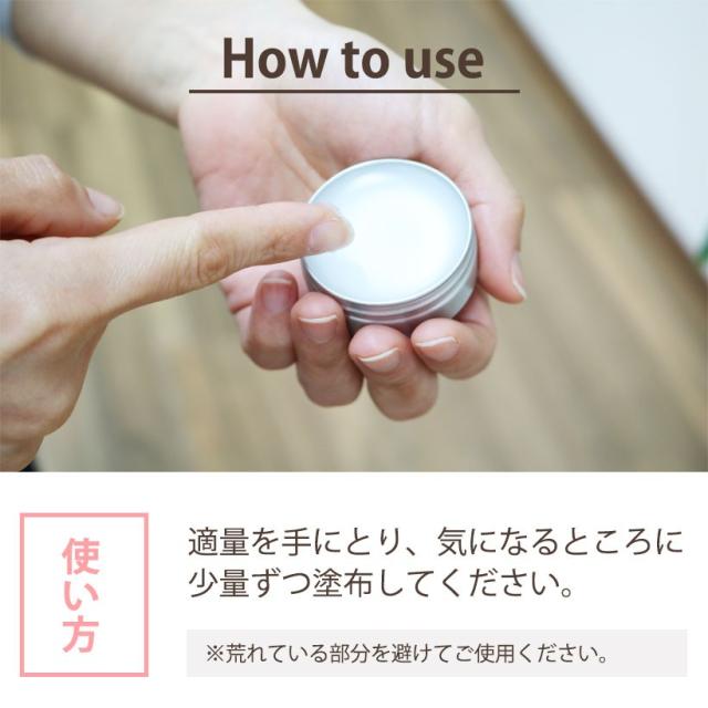 乾燥が気になる部分にお使いください。やさしい香りの練り香水代わりにも。