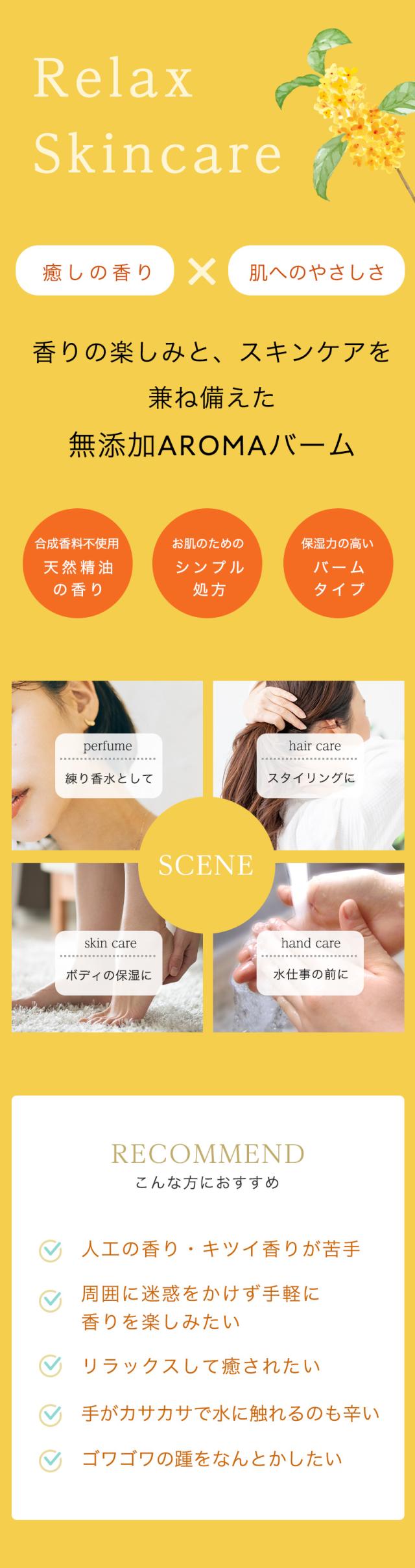 ■使用上の注意:●化粧品のため全ての方に合うとは限りません。腕の内側等でパッチテストを行ってから使用してください。●肌荒れしている箇所、目の周辺や粘膜などの敏感な部位には使用しないでください。●お肌に異常が生じていないかよく注意して使用してください。お肌に合わないときは、ご使用をおやめください。●目に入った場合はすぐに洗い流してください。●香りのアレルギーをお持ちの方、3歳未満の乳児はご使用をお控えください。●妊娠中・授乳中・持病をお持ちの方はご使用前に医師にご相談ください。●植物から抽出した精油を使用しているため、天然の香り成分は数十分程度で全て揮発します、練り香水や香油のように長時間持続しません。