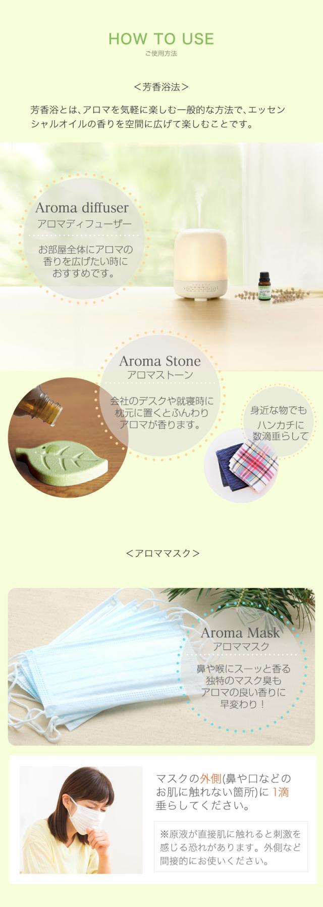 アロマストーン やハンカチなどに1滴垂らして香りをお楽しみください。 マスクにつければ、アロマの香りがスーッと鼻やのどに香るアロママスクに。 マスクなど 花粉症対策グッズ と一緒にお使いください。 ■内容量:10mL ※当該商品は 花粉症 予防 のための医薬品には分類されません。