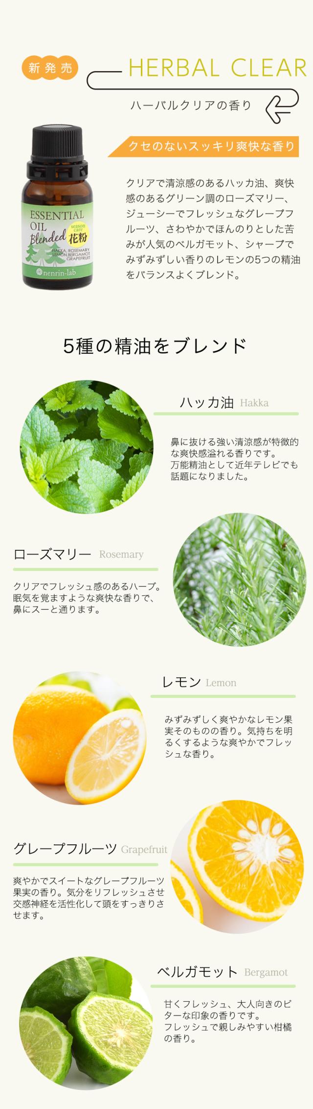ハーバルクリア/ハッカ油、ローズマリーシネオール精油、ベルガモット精油、グレープフルーツ精油、レモン精油
