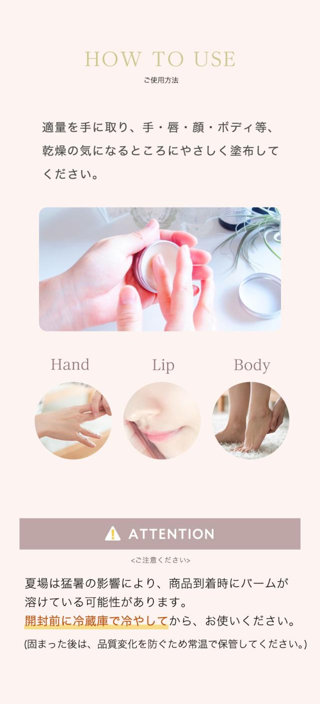 顔にもお使いいただけます。唇には低刺激のリップクリームとして、乾燥が気になる時の目元にはアイクリームとしてご利用ください。付ける回数の制限はありませんので、乾燥が気になった時にいつでもお使いください。