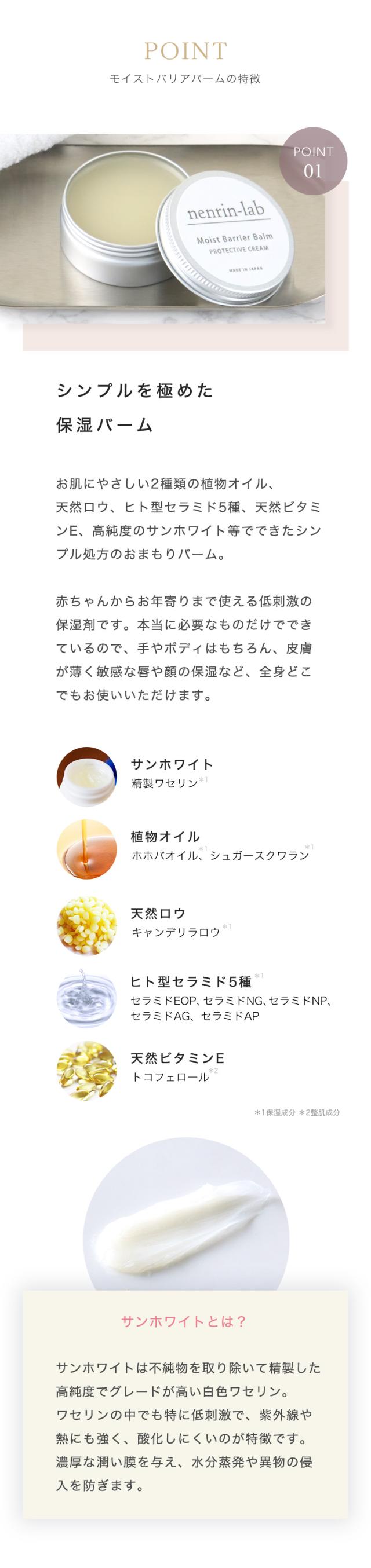 保水しながらバリア機能を守るヒト型セラミド5種、天然成分のホホバオイル、天然ロウ、不純物を取り除いたハイグレードのサンホワイトを配合。 肌に薄い膜を張ることで潤いを与え、水分蒸発や異物の侵入を防ぎます。