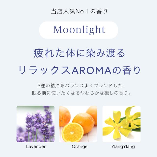 3つの天然アロマ精油をバランスよくブレンドしたやわらかなおやすみアロマの香りが、夢の中へと誘います。