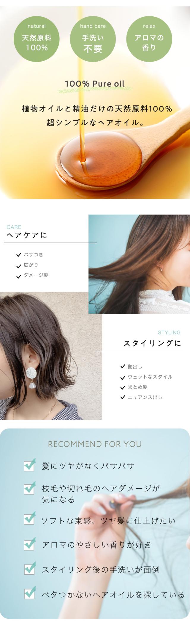 植物オイル、エッセンシャルオイル(精油)だけの天然100% 、ふんわりアロマ香るナチュラルなヘアオイル。