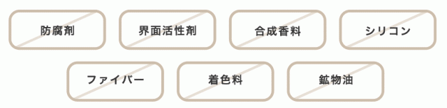 防腐剤フリー、界面活性剤フリー、合成香料フリー、シリコンフリー、ファイバーフリー、着色料フリー、鉱物油フリー