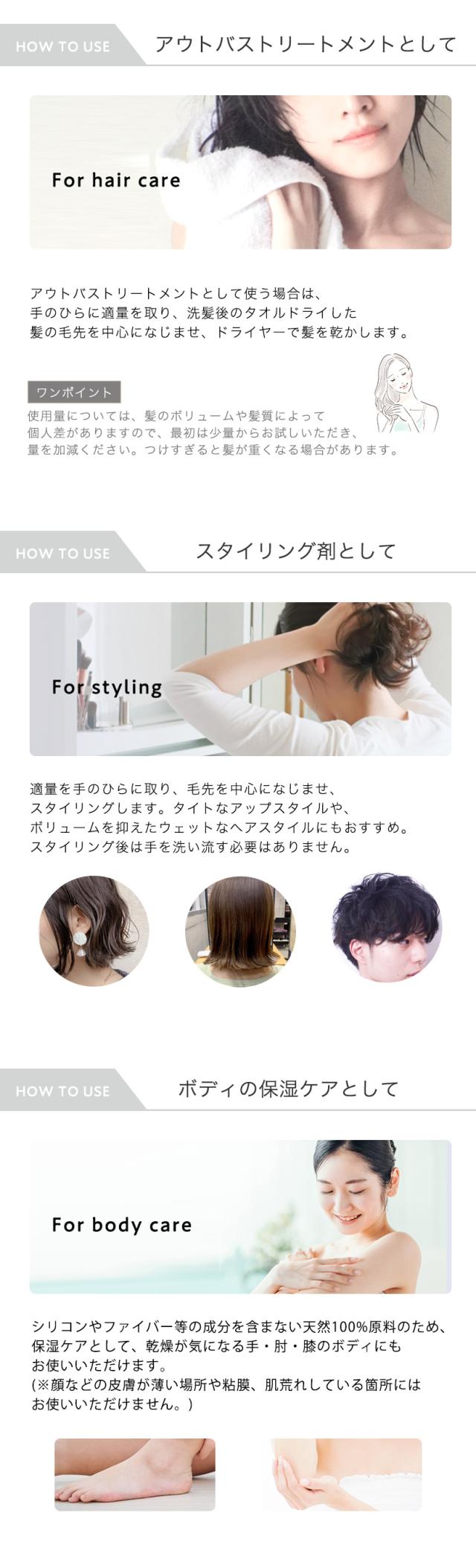 濡れた髪にはアウトバストリートメントとして、乾いた髪にはスタイリング剤として。