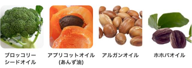 植物オイルには、天然のシリコンと呼ばれ、なめらかな手触りをもたらす「ブロッコリーシードオイル」、傷んだキューティクルを補修する「アプリコットオイル(あんず油)」、ビタミンEが豊富な「アルガンオイル」、オイルでありながら髪に軽やかなうるおいとツヤを与えてくれる「ホホバオイル」を採用しました。