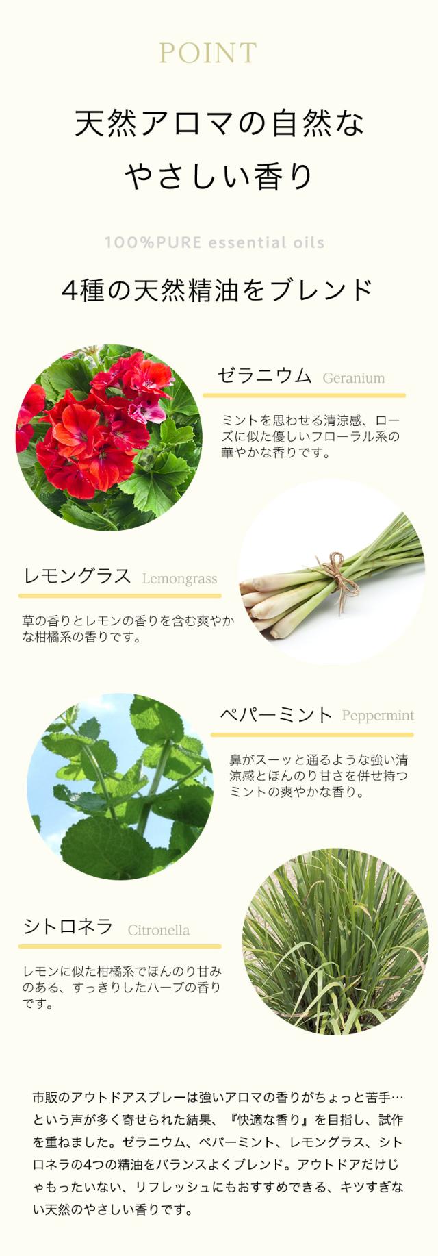 「アウトドアだけじゃもったいない!」リフレッシュにもおすすめ。 ゼラニウム、ペパーミント、レモングラス、シトロネラ精油をブレンドした天然アロマのやさしい香りです。