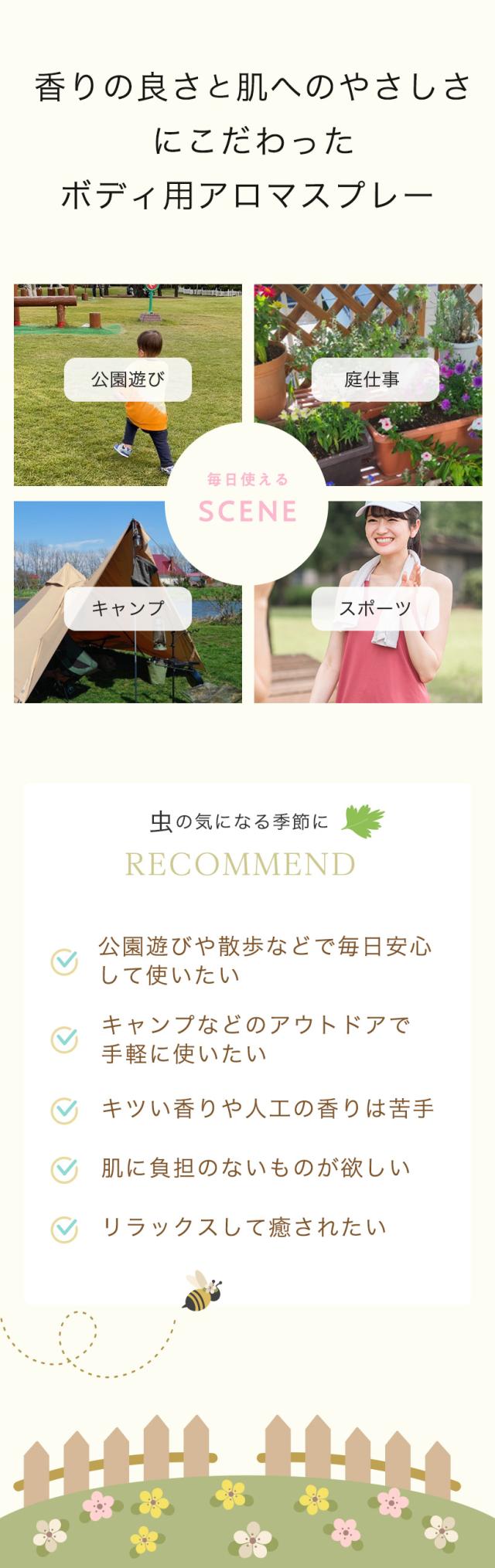 「市販のアウトドアスプレーは香りがちょっと苦手」…という声が多く寄せられた結果、『虫には不快でも、人間には快適な香り』を目指し、試作を重ねました。