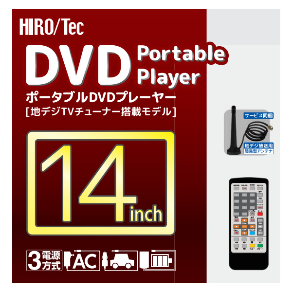【HIRO/Tec】 14インチポータブルDVDプレーヤー [地デジTVチューナー搭載モデル] ●多軸回転型モニター 液晶モニターをお好みの角度に調節可能 ●CPRM/VRモード対応 地デジ番組を録画したDVDディスクもOK ●レジューム再生機能 前回停止した位置より続き再生が可能 ●USBメモリ/SDカード対応 メモリデバイス内の画像・音楽データの再生が可能 ●音楽CDリッピング録音機能 音楽CDを外部メモリーにダイレクト録音 ●AV(RCA)入力&出力端子 RCA端子(赤・黄・白)で外部機器と接続もOK ■本体サイズ:約342×233×48mm(折りたたみ状態) ■重量:約1480g ※バッテリー含む ■電源:【本体】DC12 2.0A 【ACアダプター】100〜240V 50/60Hz ■液晶:14型TFT/LEDバックライト/1366*768RGB ※記載は商品仕様の一部です。仕様説明不足等の理由での返品はできません。特に適合等は必ずご確認ください。