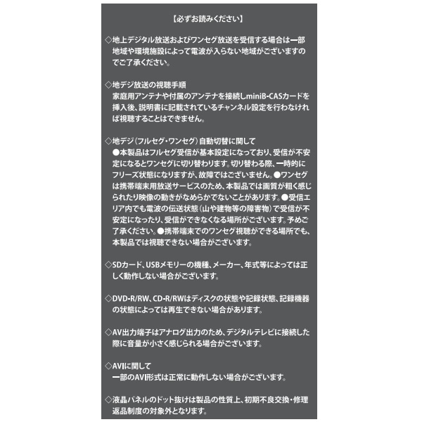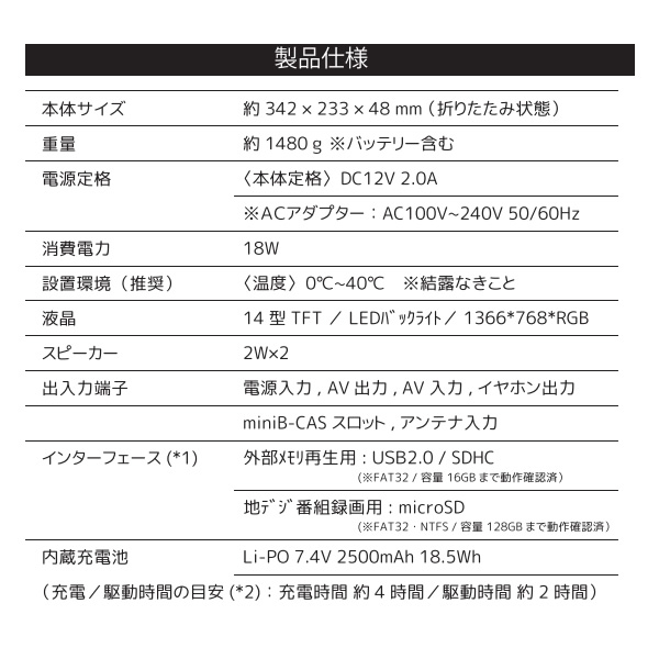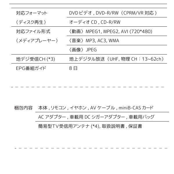 ■梱包内容:本体、リモコン、イヤホン、AVケーブル、miniB-CASカード、ACアダプター、車載用 DC シガーアダプター、車載用バッグ、簡易型TV受信用アンテナ (*4)、取扱説明書、保証書