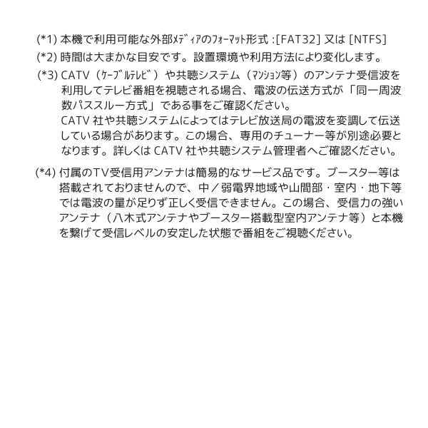 (*3) CATV(ケーブルテレビ)や共聴システム(マンション等)のアンテナ受信波を利用してテレビ番組を視聴される場合、電波の伝送方式が「同一周波数パススルー方式」である事をご確認ください。CATV社や共聴システムによってはテレビ放送局の電波を変調して伝送している場合があります。この場合、専用のチューナー等が別途必要となります。詳しくはCATV社や共聴システム管理者へご確認ください。