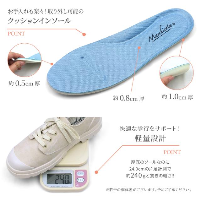 maschietta-マスチェッタ-キャンバス調のPU素材を使ったカジュアル感につま先、カウンタ−にスムースPU素材の上品さをプラス。側面にさりげないレースのラインを飾った、遊び心満載のデザイン。3Eの幅広設計で履きやすく、防滑ソールで歩きやすい、履き心地も◎クッション性のある中敷きは取り外し出来るのでお手入れ楽々、いつでも清潔。接地面から4cm4時間防水設計で雨の日も安心して履けます♪デザイン、機能性、共に優れた晴雨兼用レースアップシューズです。※完全防水ではございません。