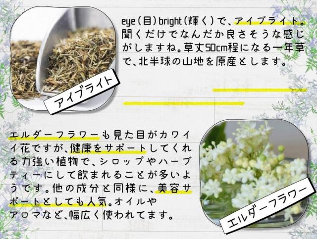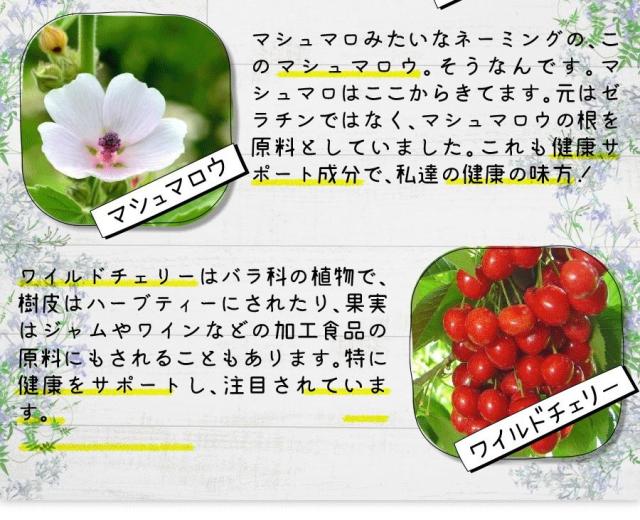 | 原材料名 | ぶどう糖、水溶性食物繊維、ジャバラエキス末、マヌカハニー、アイブライト、エルダーフラワー、ネトル、スリッパリーエルム、マシュマロウ、ワイルドチェリー/セルロース、ショ糖脂肪酸エステル、クエン酸、香料、微粒二酸化ケイ素、甘味料(スクラロース) |