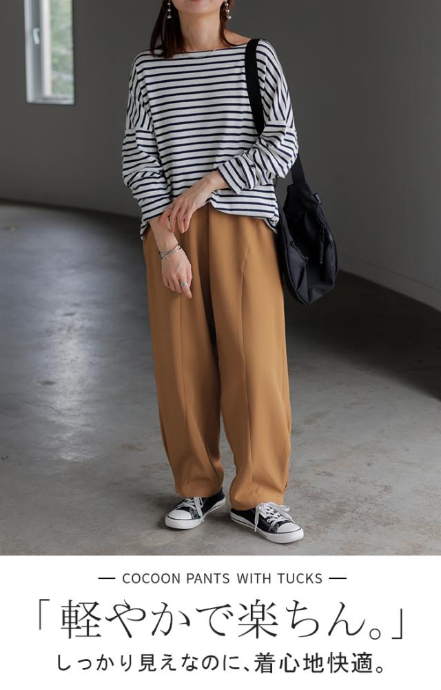 裾にタックを施し立体感のあるコクーンシルエットが特徴的なパンツです。