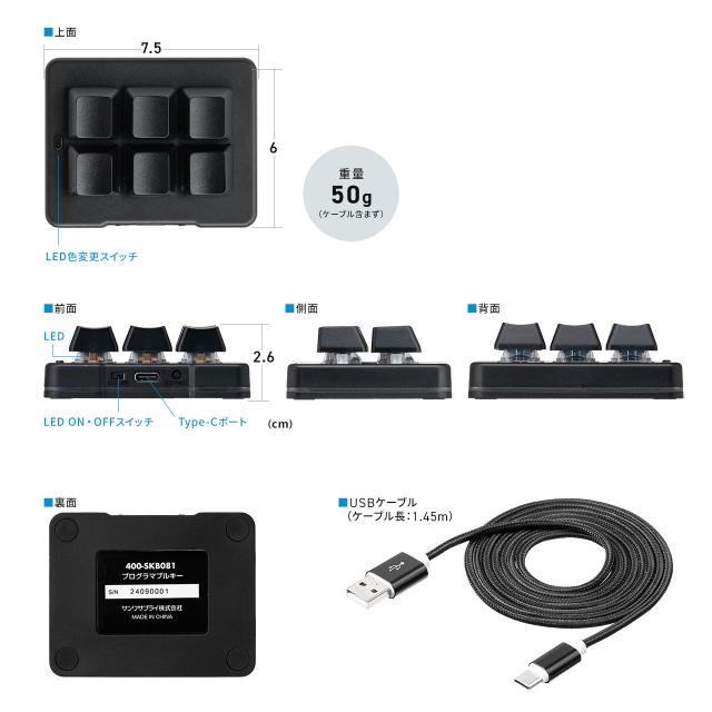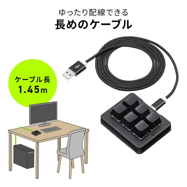 プログラマブルキーボード ミニ6キー 片手キーボード 左手デバイス ゲーミングキーボード メカニカル 青軸 割り当て 割付 バックライト付き 有線接続 カスタマイズ ブラック[400-SKB081]