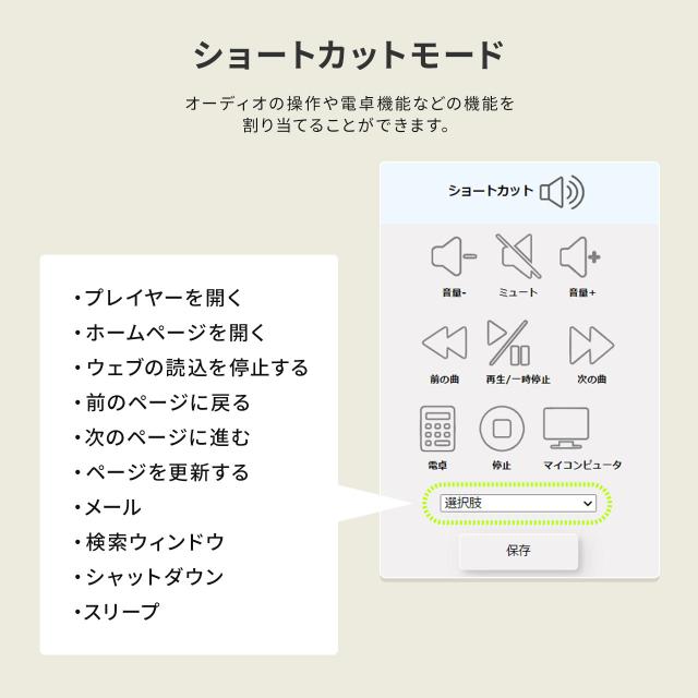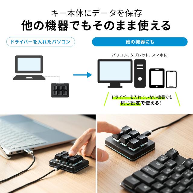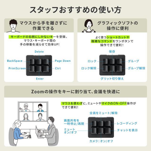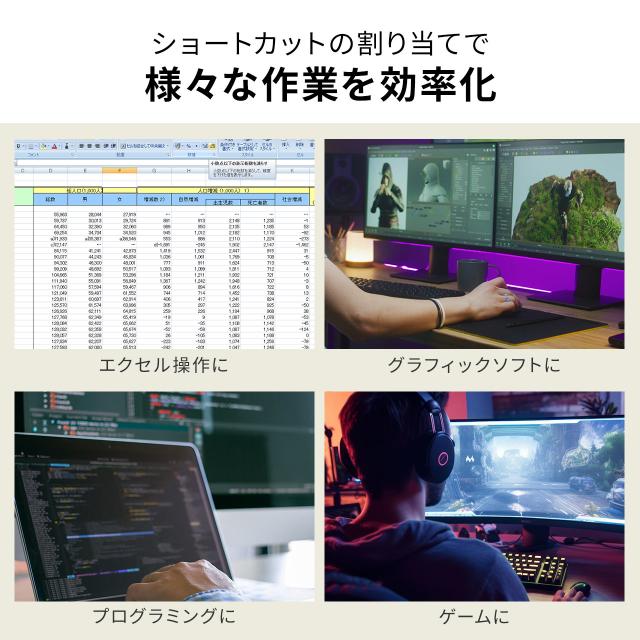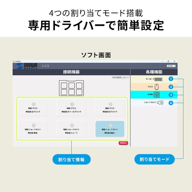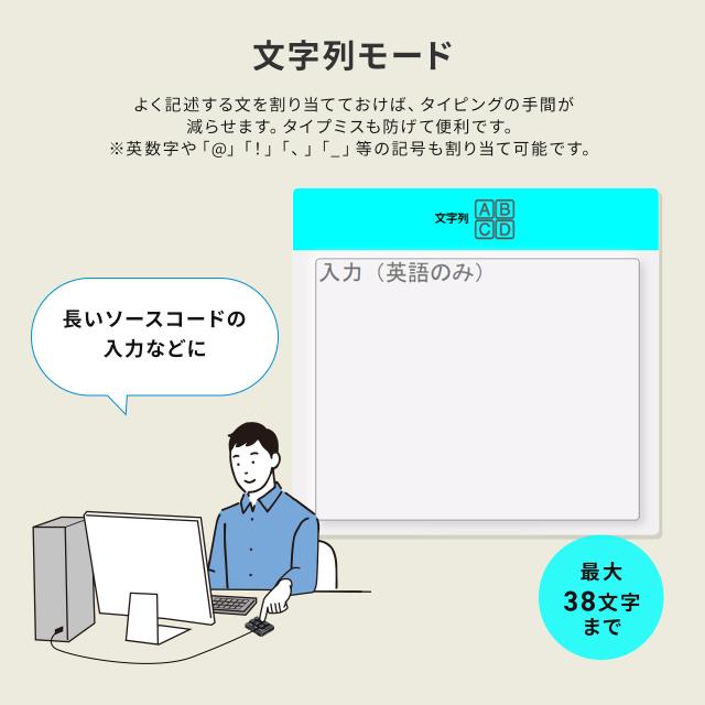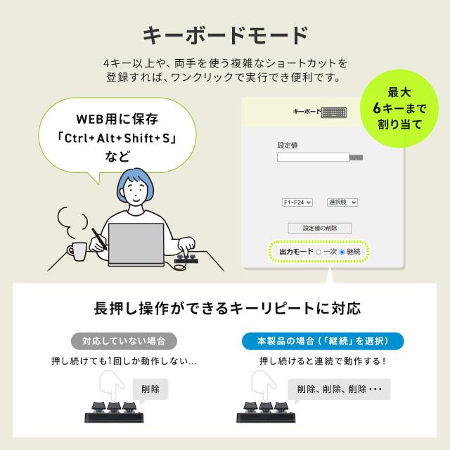 ●専用ソフトでキーボード操作やマウス操作などの機能を割り当てることができるプログラマブルキーボードです。●キーのショートカット(複数キー同時押し)や文字列を割り当て可能です。