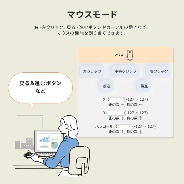 ●マウス操作のクリックボタン、戻る・進むボタン、スクロールボタン、カーソル移動などのすべてが割り当てできます。