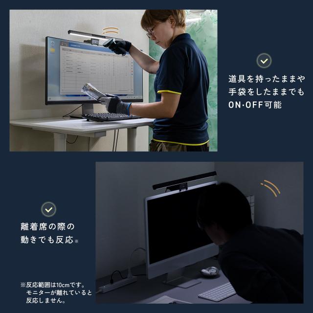 ●モニター上部に引っ掛けるだけで設置でき、手元を明るく照らすモニターライトです。●赤外線センサー搭載で、センサー部に手をかざすだけで電源ON/OFFができます。