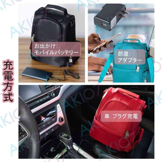◆原理・ヒーター内蔵:底部の加熱板で加熱、電熱線で加熱すると長時間保温可能。外出時は容量5000mAh以上のモバイルバッテリーをご利用ください。電源入れる途中バッグ内に水を入れないで、腐食性のもので拭かないでください。(モバイルバッテリー、車で充電可能)