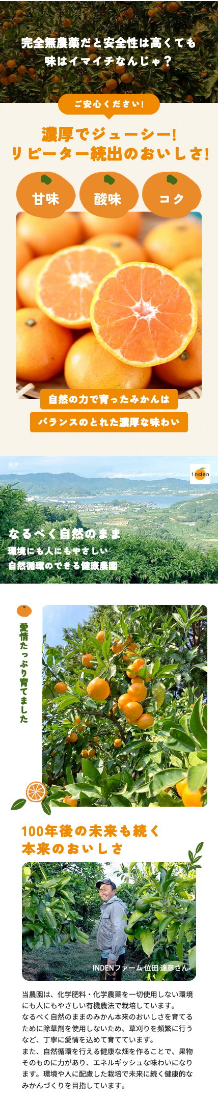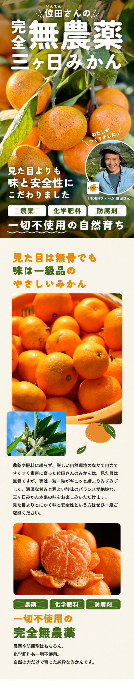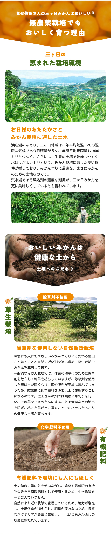 農薬や防腐剤はもちろん、化学肥料も一切不使用の完全無農薬みかんです。