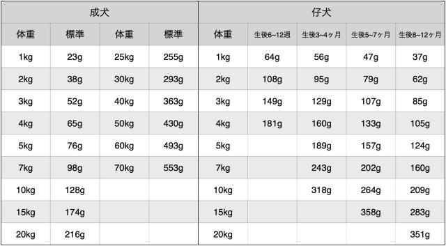 ・上記の給与量は目安です。運動量、個体差、環境、気質などにより適正な給与量は異なります。愛犬の体重や体型をチェックして、給与量はご調整ください。