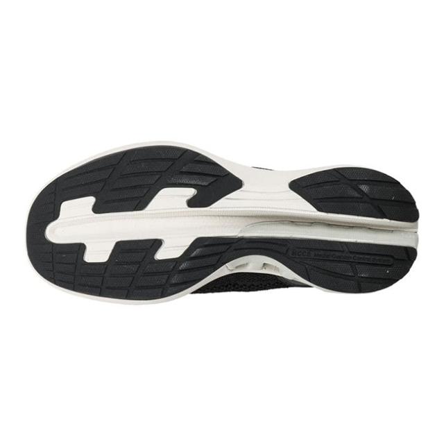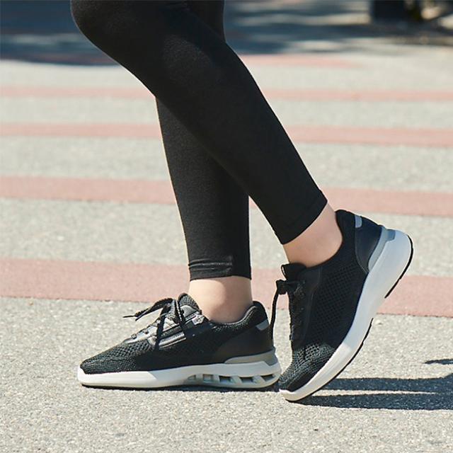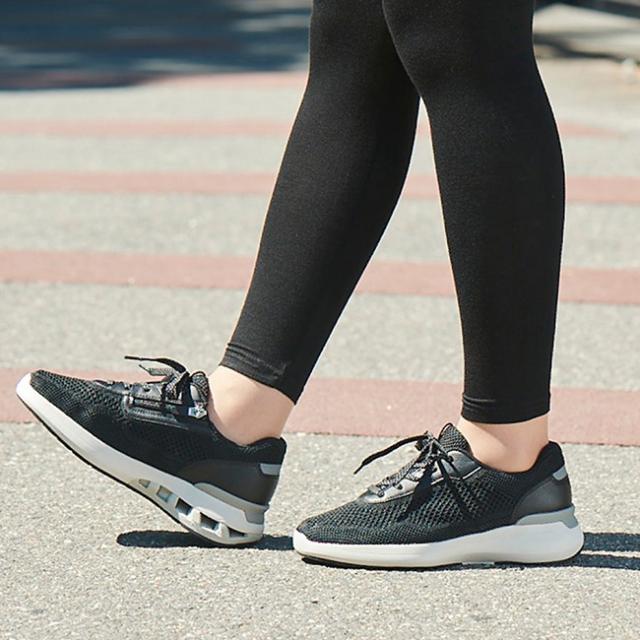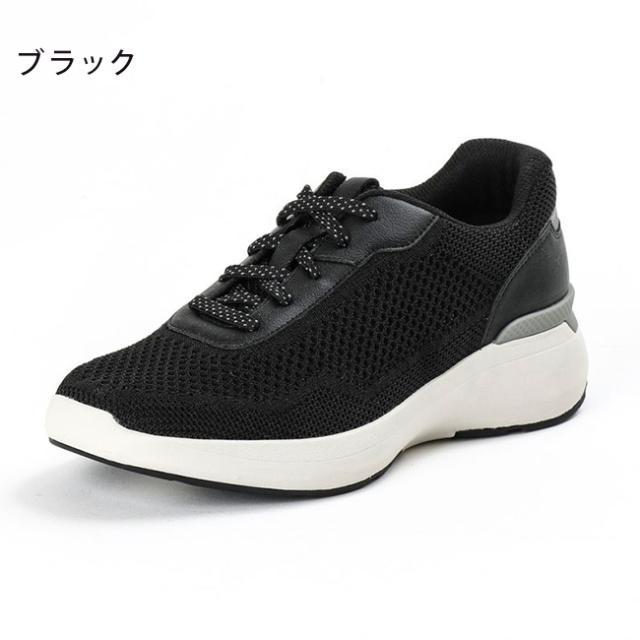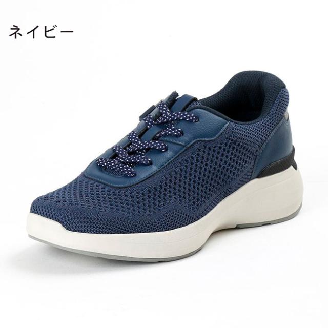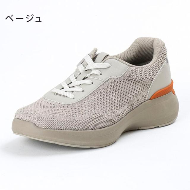 アッパーに、足にやさしくフィットするニット素材を採用、シームレス仕様で足当たりの良さに配慮。ニット素材と人工皮革(かかと、ハトメ部)のべースにリサイクルポリエステル100%の素材を採用、CO2排出量の削減に貢献。サステナビリティーの観点から企画された商品