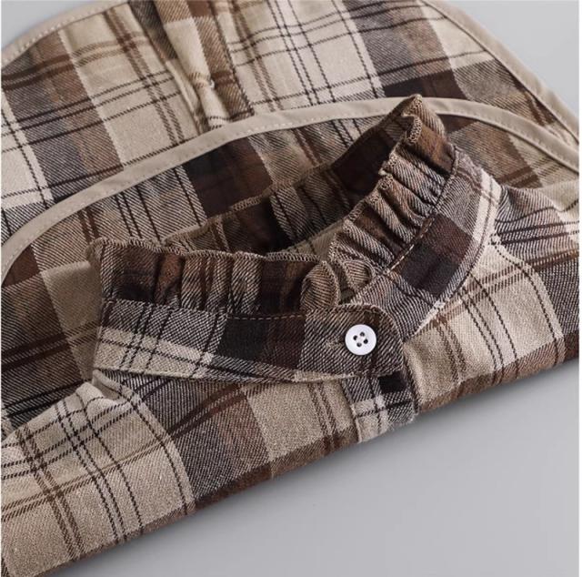 ◎チェック柄が目を引き、女性らしいラウンドカラーとフリル襟のデザインが、どんなコーディネートにも華やかさをプラスします。