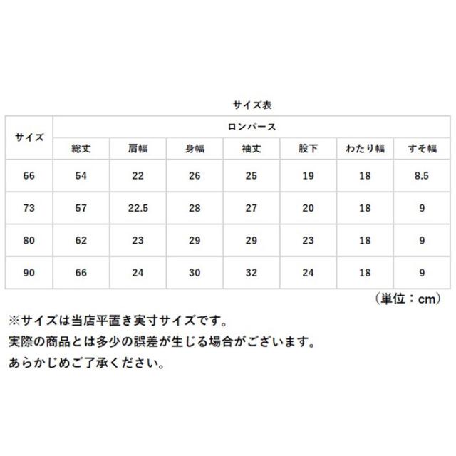 | サイズ | [ベビー] ・66cm ・73cm ・80cm ・90cm ※サイズについて詳細は、商品画像の中にあるサイズ表をご覧くださいませ。 |
